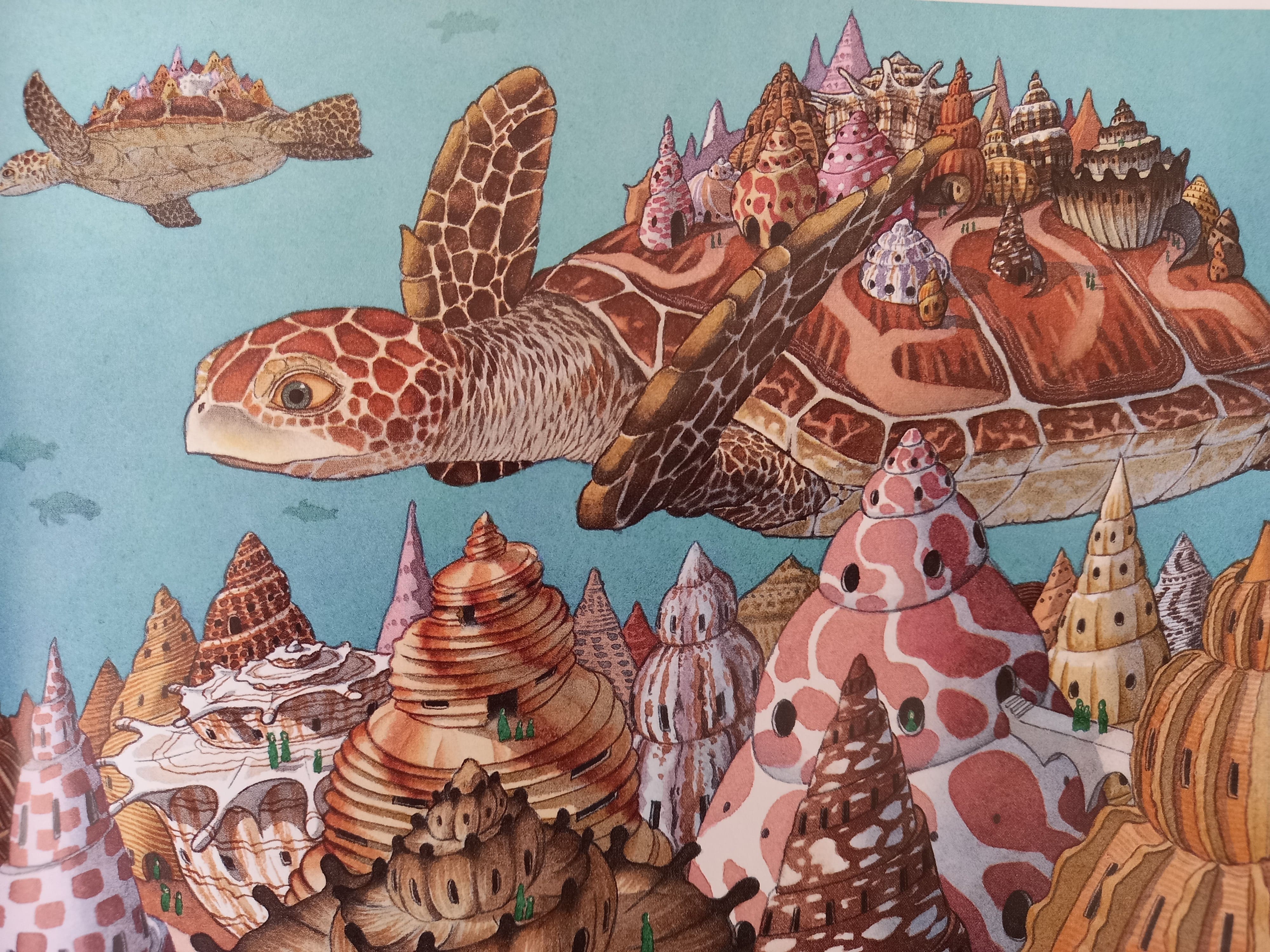 로봇물고기들이 바다 속을 헤엄치고, 문어 할아버지가 아기 문어들에게 책을 읽어 주고, 거북이 등에 지어진 소라 성들과